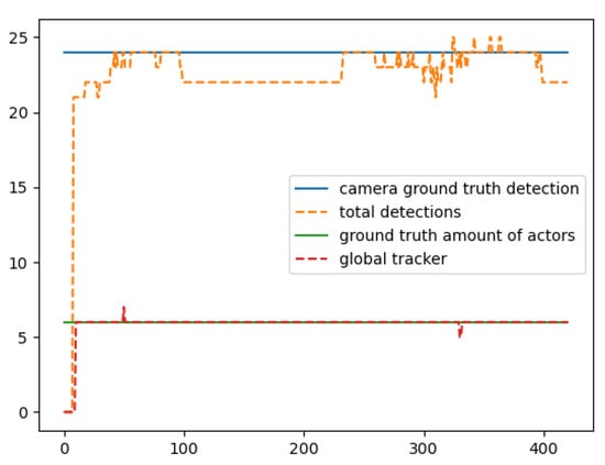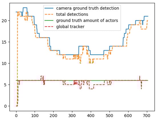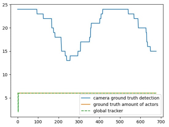 Graph showing the global tracker results in comparison to the ground truth for the cross path scenario. The vertical axis represents the number of actors, while the horizontal axis the frames.