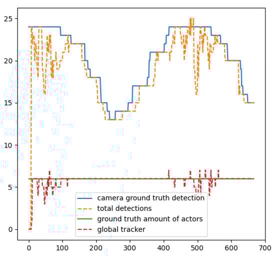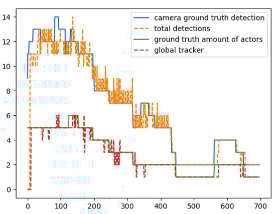 In Figure 22, Figure 23, Figure 24 and Figure 25, the red line presents the outcome of the global tracker regarding the number of actors detected, the green line presents the total detections in the scenario in every timestep (the sum of detection of all four cameras), the orange line presents the ground truth tracks of the objects, and the blue line the total detections if all cameras could see all the objects. The horizontal axis represents the iterations of the system operated in that scenario.