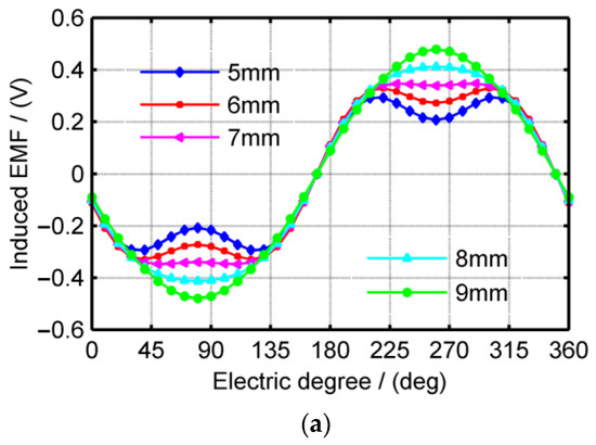 The dimensions of the PM affect the intensity of the magnetic field directly. The axial length is equal to a rotor length of 10 mm. To reduce the magnetic resistance, the thickness of the PM hpm should be set to a small value; this value was determined to be 2 mm, as shown in Figure 4. Thus, the width of the PM bpm is regulated at different values of 5 mm (initial), 6 mm, 7 mm, 8 mm and 9 mm. The corresponding results of the induced voltage waveforms are shown in Figure 8a. To present a distinct display, only the phase-A waveforms are compared.