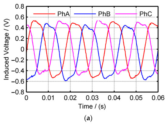 For instance, the rotor can be simulated to spin for an electrical period with different speeds, which enables the induced three-phase voltage waveforms to be obtained. As shown in Figure 6a, the three-phase voltage waveforms are obtained when the rotor speed is set to 600 rpm. To verify the accuracy of the FEM results, the initial prototype was connected to a brushless DC motor, which can be regulated to drive the prototype at different speeds, as shown in Figure 7. The experimental results of the induced voltage waveforms at 600 rpm were obtained, as shown in Figure 6b. By comparison, in one period of Phase A (Figure 6c), the experimental results are is in a good agreement with the predicted FEM results in regard to both the waveform and peak values.