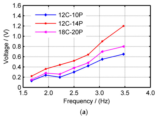 The length of the rocker was set to 132 mm, with a swing angle of 60° and a swing frequency of 2.5 Hz. Excited by the same swing motion, the open-circuit voltage outputs of the three manufactured prototypes are shown in Figure 16. Continuous voltage waveforms were generated. The optimal 12C-14P prototype produced the maximum amplitude voltage. The swing frequency was varied to explore the harvesting response performance, from 1.6 Hz to 3.5 Hz. Then, the swing angle was changed to 40°, and the frequency variation was conducted again.