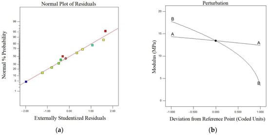 In Figure 2, the output graphs generated by the “Design Expert” software for the printed sample’s MTS are displayed. Figure 2a represents the normal plot of residuals for the MTS, showing that the residuals align closely with the trend line, indicating the conformity of the DOE for this output. Figure 2b, which is the perturbation plot for the MTS, examines the simultaneous effects of two parameters, WT and LT, on the MTS of the samples. Figure 2c presents the surface plot for the MTS of the samples. Based on this plot and the 2D contour plot of the MTS (Figure 2d), it can be observed that the MTS increases with a decrease in the WT of the printer. This is because reducing the WT results in thinner printed layers, leading to better filament consolidation in the samples. Increased consolidation of the printed layers requires more force to separate the samples, ultimately resulting in an increase in the MTS. Furthermore, considering the red regions in Figure 2d, the MTS of the samples is maximized when the WT parameter is set to a lower value for the printer. This is because decreasing the WT increases the print density and filament consumption, which leads to an increase in the MTS of the samples.