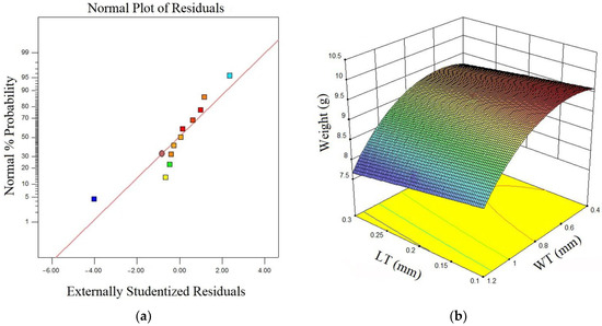 In ANOVA, Table 5, the designed model for the weight of the samples after 3D printing is presented. In this model, the effects of the input parameters on the weight of the samples, as well as the second-order effects of WT, are analyzed. Based on the p-values, the effects of the parameters and the experimental model are found to be significant. Considering ANOVA, Table 5, and the coefficients Equation (2), it can be concluded that the effects of the WT parameter on the weight of the printed samples are greater compared to the effects of the LT parameter.