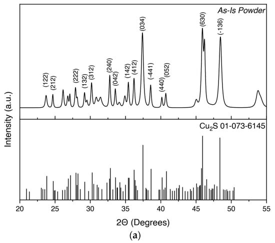 Powder XRD was performed on (as-received powder) and on 3D printed parts (after sintering and after the sulfur infusion process) to observe the alterations in the chemical structure of Cu2-xS specimens in the sintering and post-processing steps. Prior to the XRD analysis, 3D printed samples were ground into a homogenous powder using a mortar and pestle. The XRD pattern data for the Cu2S powder, as received from the manufacturer, is shown in Figure 6a. According to these results, the precursor material was in close agreement with monoclinic Cu2S (ICDD 01-073-6145) which was expected to have minimal impurities present. Figure 6b presents the pattern data for Cu2-xS samples after sintering at 1273 K for 30 min. Strong Cu peaks are observed since sulfur volatilizes during the sintering process, allowing for the migration of free copper ions to the surface of the samples. The same phenomenon has been reported to occur in the literature []. However, after the sulfur infusion process, the Cu peaks are no longer as prominent as shown in Figure 6c, indicating the reabsorption of the free Cu into the material.