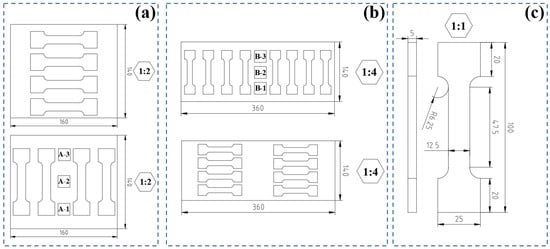 Metallographic samples and tensile test samples location within specimen A (a), metallographic samples and tensile test samples location within specimen B (b), and dimensions of the tensile test samples (c).