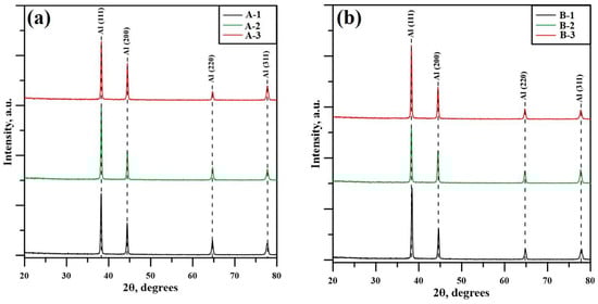 The X-ray diffraction patterns of both specimens are shown in Figure 3a,b, where the first corresponds to specimen A, and the second to specimen B. In both cases, a polycrystalline structure was observed, confirmed by the absence of amorphous-like halos. All detected peaks correlate to a face-centered cubic (fcc) structure characteristic of aluminum samples []. Both specimen A and specimen B have a highly textured structure at all stages of build-up with diffraction maxima corresponding to (111), (200), (220), and (311) crystallographic planes, which belong to the {111}, {100}, {110}, and {311} families of crystallographic planes, respectively. No significant change in the texture of the samples was observed as a function of the build-up stage or the size of the components. In addition, all detected peaks have a narrow width indicating the presence of low internal defects within the crystal lattice of the aluminum phase. Similar results were observed in previous studies [], where no preferred crystallographic orientation was detected and the diffraction maxima had a narrow width corresponding to a low concentration of crystal defects. In addition, in that work, an Al2O3 phase was detected on the surface of the substrates. This was caused by defects in the sample preparation procedure, which were avoided in the present study. Su et al. [] have also studied diffractograms obtained for Al5356 samples. Most likely due to the multi-pass approach, they managed to detect peaks corresponding to the Al3Mg2 intermetallic phase in the range of 25–35° at the 2θ scale. In the present work, however, even if small contents of the Al3Mg2 phase are present in the structure of the samples, this is not enough to be detected by the diffractometer.