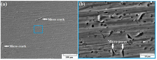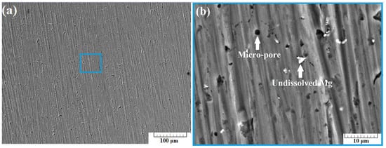 Figure 4a presents a SEM image of the surface of sample A-1 taken using back-scattered electrons (BSE) at a 500× zoom. In the image, two micro-cracks with a length of about 70 µm were observed. Increasing the zoom to 5000× results in obtaining the image presented in Figure 4b. Some quantity of micro-pores was observed in the structure of the specimen, along with some undissolved Mg particles.