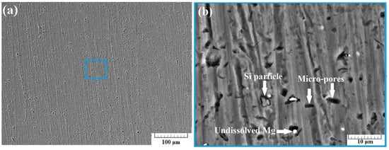 Figure 5a presents a SEM image of the surface of sample A-2 taken using back-scattered electrons (BSE) at a 500× zoom. In the image, no cracks were observed. Increasing the zoom to 5000× results in obtaining the image presented in Figure 5b. Some quantity of micro-pores was observed in the structure of the specimen, along with some undissolved Mg particles. A large undissolved Si particle was also observed.
