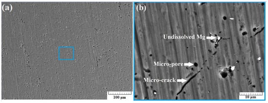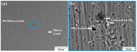 Figure 8a presents a SEM image of the surface of sample B-2 taken using back-scattered electrons (BSE) at a 500× zoom. A few micro-cracks were observed, with their average length being about 10 µm. Furthermore, some undissolved Mg particles were also noticed.