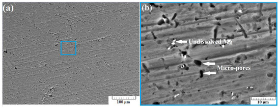 Figure 9a presents a SEM image of the surface of sample B-3 taken using back-scattered electrons (BSE) at a 500× zoom. Micro-sized pores with an irregular shape distributed across the surface of the sample were observed. Once again, undissolved Mg particles were also noticed.