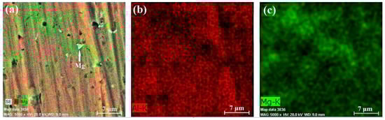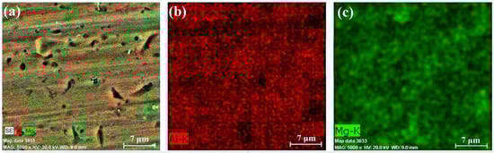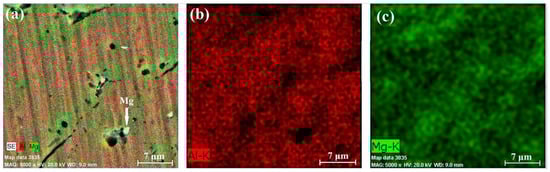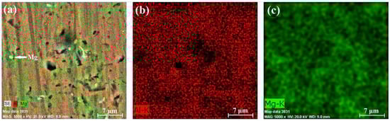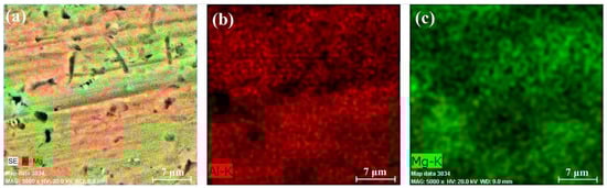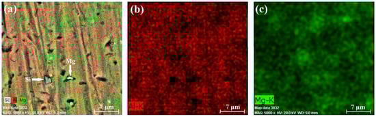 EDX results of section B-1: chemical composition map (a), aluminum content (b), and magnesium content (c).