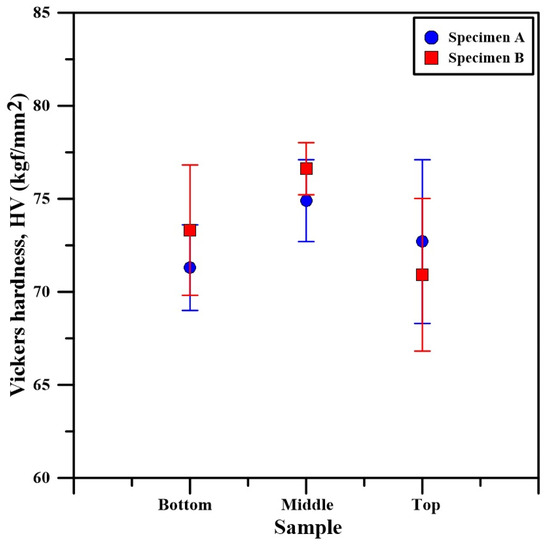 Vickers hardness of the bottom, middle, and top sections of specimens A and B.