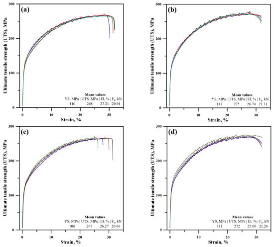 The ultimate tensile strength (UTS) test experiments results, consisting of four repeats, are shown in Figure 17 as a function of the strain rate. Figure 17a shows the results corresponding to specimen A in the vertical orientation of the specimen build-up process, and Figure 17b shows the results of the same specimen in the horizontal direction of build-up. Likewise, Figure 17c,d present the results for specimen B in the vertical direction and horizontal direction of build-up. The yield strength (YS) of all samples depending on the specimen and the direction of build-up is in the range of 106–111 MPa. The ultimate tensile strengths (UTS) of the studied samples are in the range of 267–275 MPa. The elongation is in the range of 25–27% in all cases. The breaking force Fb, in other words the maximum sustainable load, is in the range of 20.66–21.31 kN. Wang et al. [] performed tensile experiments on a WAAM-CMT built specimen and have found that the manufactured component had an YS of 114 MPa in the horizontal and 85 MPa in the vertical direction with an elongation ranging between 19.3 and 24.9% depending on the orientation. Apparently, the concentration of macro-defects within the structure of that specimen in the vertical direction is slightly higher compared to the ones in the present research. The UTS of the sample obtained by Wang et al. [] is in the range of 220–263 MPa. Wieczorowski [] also studied the possibility of manufacturing of an Al5356 specimen using WAAM-CMT; however, they employ a very low heat input during the process by limiting the power input. The obtained results regarding the tensile experiments are YS of 120 MPa and UTS of 252 MPa with a 17.4% elongation. All experiments are performed in the horizontal direction. Li et al. [] have also performed tensile experiments on WAAM-CMT built specimens and found the YS and the UTS of the specimens in both directions of build-up to be 125 MPa and 270 MPa, accordingly. Similarly, Derekar et al. [] have reported an YS of 115 MPa and an UTS of 265 MPa in all directions of build-up of WAAM-CMT built Al5356 specimens. Comparatively, the obtained results in the present data are in complete agreement with those obtained by previous researchers.