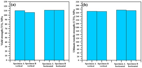 Comparison between the YS of the specimens (a), between the UTS of the specimens (b).