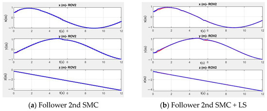 The blue lines represent the desired trajectories, while the red lines show the actual movement of the ROV follower. In the following simulations, only the results for ROV2, which is the follower robot, are presented. This is because ROV2 faces the biggest challenges in terms of communication, and this challenge is an area of opportunity.