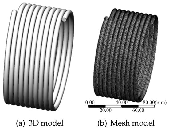 With regard to the electromagnet coil commonly used in industry, the diameter of enameled wire is generally less than 1 mm and the total winding turns reaches hundreds of turns [,], which leads to simulation being impossible due to the huge number of grids. However, Equations (11) and (12) relate to the general law of electromagnet coil, regardless of the diameter and total winding turns. So, this paper simulates the power consumption under the conditions of “large diameter” and “few turns” in FEM, and tests the power consumption under the condition of “few diameter” and “large turns” in experiment. Based on the above idea, the simulation model of the electromagnet coil is established in Figure 3.
