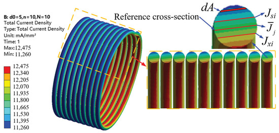Taking scheme 1 in Table 2 as an example, the other schemes can be obtained by winding the series enameled wires on top of the original one. The total current density distribution of the electromagnet coil is shown in Figure 4.