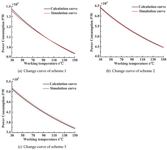 In the three different schemes shown in Table 2, the change curves of power consumption with working temperature are shown in Figure 5. Among them, the calculation curves are obtained using Equations (11) and (12), and the simulation curves are obtained using FEM in Figure 4.