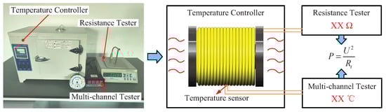 In Figure 6, the test platform of the electromagnet coil is composed of three parts: a temperature controller, a resistance tester and a multi-channel tester. Among them, the temperature controller is used for heating the coil to the preset temperature, and the actual temperature of coil is displayed by the multi-channel tester via the temperature sensor. The resistance of the coil at the preset temperature is displayed by the resistance tester and converted to the power consumption using Equation (1). The test platform was used in a previous study by the authors’ team [].