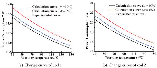 The results of Figure 8 are also quantitatively analyzed using Equation (17). Among them, the relative deviation of coil 1 is 2.97% with a 10% stretch ratio and 6.31% without a stretch ratio. The relative deviation of coil 2 is 3.11% with a 10% stretch ratio and 5.84% without a stretch ratio. According to the above results, it can be seen that considering the stretch ratio of the copper wire can improve the calculation accuracy of power consumption.