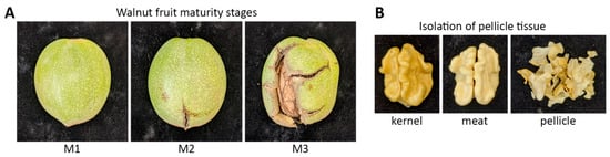Representation of samples used in this study. (A) Walnut fruit maturity stages. Intact Hull (early, M1), hull split (intermediate, M2), and hull bloom (late, M3). These stages are determined by the level of the hull (exocarp) split; (B) Isolation of pellicle tissue used for proteomic analysis. The commercial product (kernel) comprises the meat (walnut embryo + endocarp) surrounded by the pellicle tissue that develops a darker color. Pellicle tissues were separated from the meat and used for proteomic analysis.