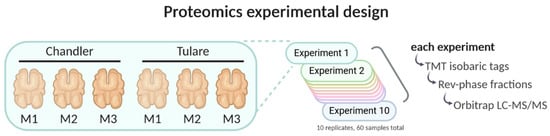 Proteomics experimental design. Kernel pellicle samples from cultivars ‘Chandler’ and ‘Tulare’ from three maturity stages (M1, M2, and M3) were used. Ten replicates of each sample type were used in total. Each mass spectrometry experiment consisted of one sample from each of the six sample types labeled with isobaric tags for quantitative comparison. Each experiment was reverse-phase fractionated in 8 samples according to hydrophobicity for deeper identification using Orbitrap Lumos LC-MS/MS. Created with Biorender.com.