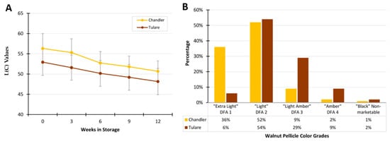 Colorimetric analysis of ‘Chandler’ and ‘Tulare’ kernels. (A) Average and standard deviation of Minolta L(C) values for kernels stored at 25 °C for 12 weeks (n = 150 kernels per cultivar were evaluated); (B) Proportion of postharvest kernel darkening incidence for ‘Chandler’ and ‘Tulare’ cultivars of English walnut. All kernels used for pellicle extraction used in the proteomics analysis were from color grades DFA1 and 2 (n > 2000 kernels per cultivar were evaluated, see Methods). Dried Fruit Association (DFA) grades according to USDA walnut color chart.