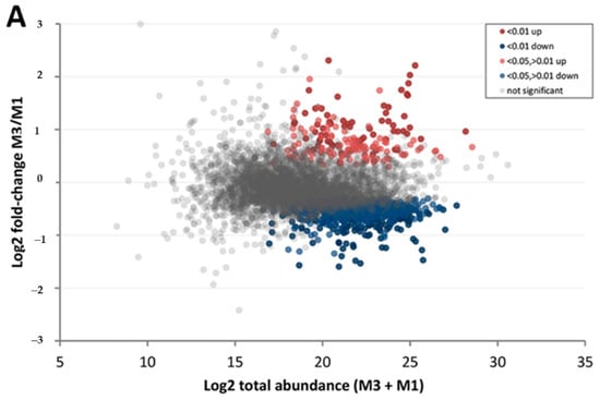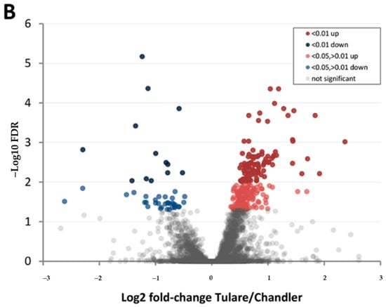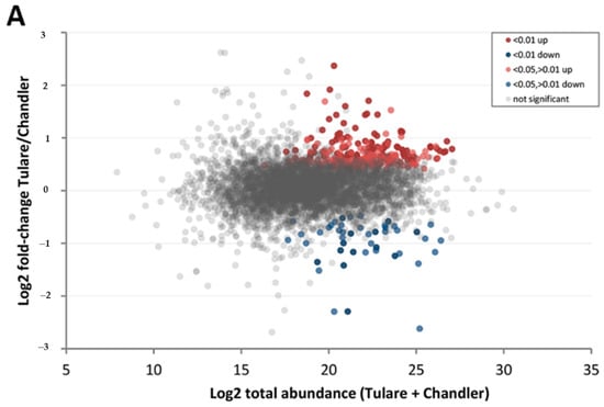 Visual representation of ‘Tulare’ and ‘Chandler’ proteomes compared at harvest stage. (A) Ratio vs. abundance plot of cultivar ‘Tulare’ compared to ‘Chandler’ at harvest (M2) stage, as listed in Table 1. Each dot represents the abundance of a protein, colored by the significance of the difference between ‘Tulare’ and ‘Chandler’. High confidence values (FDR < 0.01) are colored dark red (higher in ‘Tulare’) or dark blue (higher in ‘Chandler’), and medium confidence value (FDR < 0.05, >0.01) in lighter red and blue tones. Proteins without significant difference between cultivars are colored gray; (B) Volcano plot showing ‘Tulare’ vs. ‘Chandler’ fold-change ratios of proteome at harvest (M2) sorted by confidence levels, using the same color scheme.
