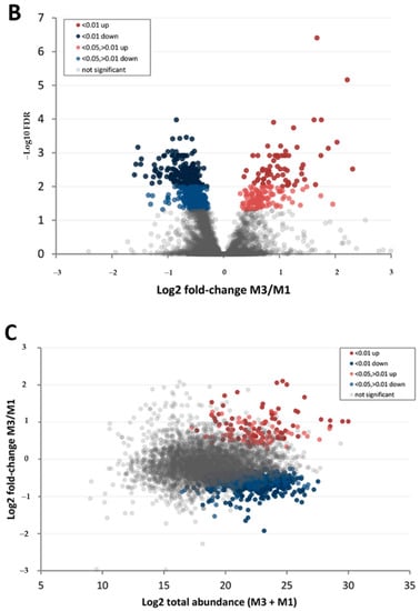 While most of detected proteins did not show a significant difference between late and early maturity stages, a higher proportion of those with significant differences show reduced abundance in the late maturity stage on both cultivars, possibly due to a lower metabolic activity as maturation progresses. This trend is observed both on the group of proteins with differential abundance considered “high confidence” (FDR < 0.01) and those considered “medium confidence” (FDR between 0.05 and 0.01). Proteins detected with differential abundance but with FDR higher than 0.05 were not considered as differentially abundant in the comparisons. Complete sets of this differential abundance analysis are shown in Table S2. A stringent threshold of FDR < 0.01 for “high confidence” was used given the high number of replicates (ten) for each sample type. Protein abundance spanned six orders of magnitude, and its effect on abundance ratio and confidence level is shown in Figure 5A,B for cultivar ‘Chandler’ and Figure 5C,D for ‘Tulare’. No specific threshold was applied on the fold-change ratio to avoid false-negative results, but the confidence filter (FDR < 0.05) does affect the minimum fold-changes considered significant, as can be seen on Figure 5, both for ‘Chandler’ and ‘Tulare’ cultivars.