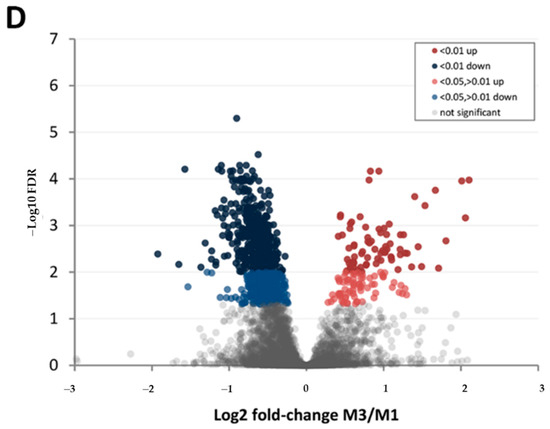 Representation of ‘Chandler’ and ‘Tulare’ proteomes during fruit maturation. (A) Ratio vs. abundance plot of cultivar ‘Chandler’ comparing late (M3) and early (M1) maturity stages, as listed in Table 1. Each dot represents the abundance of a protein, colored by the significance of the difference between M3 and M1. High confidence values (FDR < 0.01) are colored dark red (higher in M3) or dark blue (higher in M1), and medium confidence value (FDR < 0.05, >0.01) in lighter red and blue tones. Proteins without significant difference between M3 and M1 stages are colored gray; (B) Volcano plot showing M3 and M1 fold-change ratios of ‘Chandler’ proteome sorted by confidence levels, using the same color scheme; (C) Similar ratio vs. abundance plot of cultivar ‘Tulare’; (D) Volcano plot for ‘Tulare’ M3 vs. M1 samples.