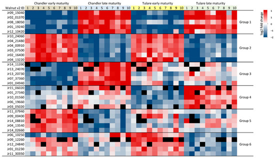 Heatmap of protein abundance ratios comparing early and late maturity stages, for cultivars ‘Chandler’ and ‘Tulare’. The ten replicates for each of the four sample types are shown, and individual ratios were calculated using the average of the condition compared. Missing values for a particular replicate are shown in black. Protein markers in the lower abundance range are sometimes not detected in a particular replicate but given the 10 replicates used still have enough data for the difference between conditions to surpass the confidence filter. Markers with higher abundance in late maturity (M3) in both cultivars are shown in Group 1. Those higher in early maturity (M1) in both cultivars are in Group 2. Groups 3 and 4 show markers higher in M3, only in ‘Chandler’ or ‘Tulare’, respectively. Groups 5 and 6 show markers higher in M1, only in ‘Chandler’ or ‘Tulare’, respectively. Complete lists of proteins with significant differential abundance are shown in Table S2.