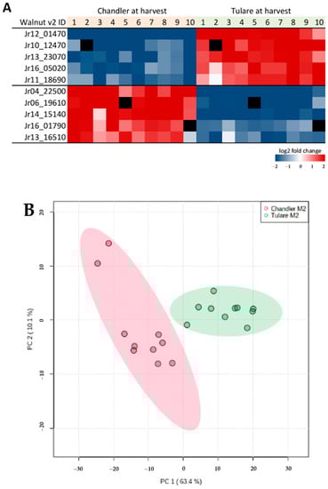 Among the 46 proteins with higher abundance in ‘Chandler’ relative to ‘Tulare’at harvest stage M2, thaumatin-like protein 1 (Jr04_22500), class V chitinase (Jr06_19610), beta-glucosidase BoGH3B (Jr14_15140), multicopper oxidase LPR2 (Jr16_01790), and glutathione S-transferase U17 (Jr13_16510) stand out (Figure 8A). The complete set is listed in Table S2. PCA analysis of M2 samples using the 321 proteins with differential abundance shows distinct clusters according to cultivar type (Figure 8B). Gene ontology analysis was also performed on the protein lists with differential abundance between cultivars ‘Tulare’ and ‘Chandler’, resulting in 250 and 45 mapped proteins with higher abundance in ‘Tulare’ and ‘Chandler’, respectively. The most overrepresented terms in cultivar ‘Tulare’ are shown in Table 4. The 46 proteins with higher abundance in ‘Chandler’ did not show overrepresented GO terms in any category, except PANTHER protein class, which highlighted “peroxidase” based on two hits from that list. The complete GO analysis results are shown in Table S3.