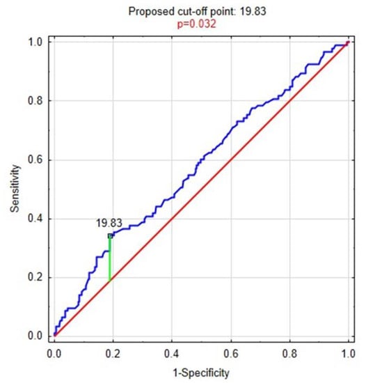 The levels of magnesium were analyzed with regard to depressive symptoms. The cut-off point for the level of magnesium was searched for. For this purpose, the ROC curve analysis was performed. The cut-off point was 19.83 mg/L. The ROC curve is presented in Figure 1.