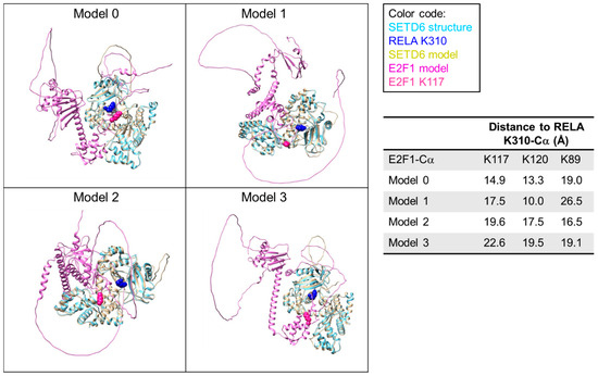 Compilation of AlphaFold 3 models of the SETD6–E2F1 complex. E2F1-K117 is highlighted in pink spheres. The models were superimposed with the SETD6-RELA structure (pdb 3qyx) [] and K310 of RELA is shown as blue sphere to indicate the location of the SETD6 active site. Average pLDDT scores for different protein parts are provided in Supplementary Table S1.