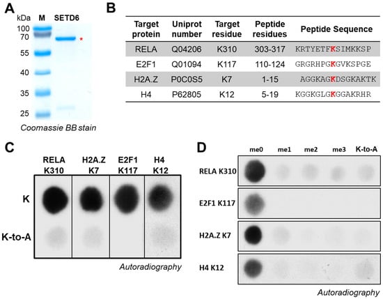 To investigate the substrate recognition of SETD6 at the level of lysine residues interacting with its active site cleft, we analyzed the specificity of peptide methylation by purified SETD6 (Figure 2A). Peptide SPOT arrays presenting peptides covalently linked to a cellulose membrane provide powerful experimental tools to investigate the activity and specificity of PKMTs [,]. To study the activity of SETD6 in a diverse sequence context, we focused on the RELA K310 [], E2F1 K117 [], H2A.Z K7 [], and H4 K12 [] substrates (Figure 2B). First, pilot peptide arrays were prepared to validate the specific monomethylation of all substrate peptides at the target position (Figure 2C,D). Lack (or almost lack) of methylation of the K-to-A control peptides indicated that the additional lysine residues present in these sequences are not (or only very poorly) methylated by SETD6. Hence, the respective target lysine residues are the only lysine residues that are strongly methylated in the corresponding peptide.