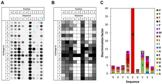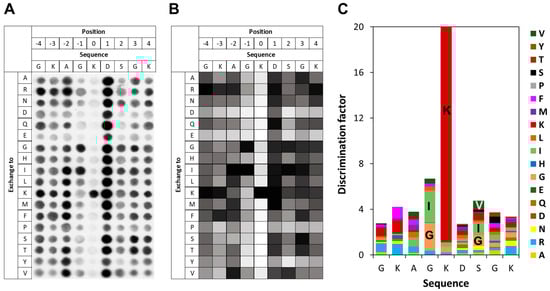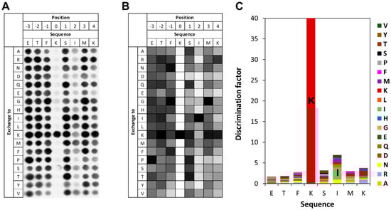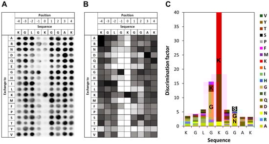 Peptide arrays were prepared using the SPOT synthesis technique using an Autospot Multipep peptide array synthesizer (CEM Corporation, Matthews, Pittsburgh, PA, USA) []. Based on the Autospot Reference Handbook (CEM Corporation, Matthews, Pittsburgh, PA, USA) each peptide spot contains approximately 9 nmol of peptide in a diameter of 2 mm. The successful synthesis of peptide arrays was validated by Bromophenol blue staining [,].