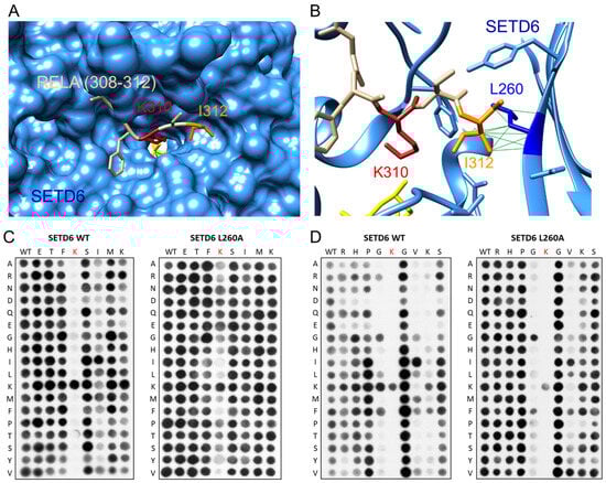 A crystal structure is available of SETD6 with bound RELA peptide (308–312) (pdb 3RC0) []. It shows the peptide bound into a deep cleft of the SETD6 protein (Figure 7A). Our results reveal a specific recognition of E2F1-I312, which is located in a hydrophobic pocket with a particularly close interaction with SETD6-L260 (Figure 7B). We, therefore, have created and purified the SETD6-L260A mutant (Supplementary Figure S1) and analyzed its substrate specificity. As data with NSD1 and NSD2 indicated that enzyme mutations generating more space in the enzyme–peptide interface can lead to the catalysis of higher methylation states [], we tested if L260A can also methylate substrates with Kme1 at the target site (Supplementary Figure S1C). However, this was not the case, suggesting that L260A like WT SETD6 can only introduce monomethylation.