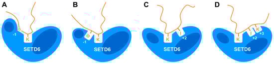 Protein methylation involves transferring a methyl group from S-adenosyl-L-methionine (AdoMet) to specific amino acid residues, such as lysine, arginine, histidine, asparagine, and glutamine [,]. Methylation of lysine residues on histone and non-histone proteins is catalyzed by protein lysine methyltransferases (PKMTs) [,,,]. Most of them belong to the group of SET domain PKMTs [], while others are 7β-strand enzymes []. SET Domain-Containing Protein 6 (SETD6) is a lysine mono-methyltransferase and a member of the SET domain PKMT family []. The SETD6 enzyme comprises an N-terminal domain, followed by the SET domain containing the active site, and a C-terminal domain. It was initially discovered to monomethylate K310 of RELA [] but, in the following years, a large number of additional SETD6 substrates have been identified (Table 1). In a cellular context, SETD6 methylation events were shown to impact cell signaling, chromatin regulation, the binding affinity of modified transcription factors, and gene regulation []. Of note, SETD6 monomethylates its substrate proteins at defined lysine residues although they are located in very variable amino acid sequence contexts. In most cases, it methylates only one lysine residue on each substrate protein, indicating that the enzyme must interact in a specific manner with its distinct substrates, a feature that is best described as multispecificity.