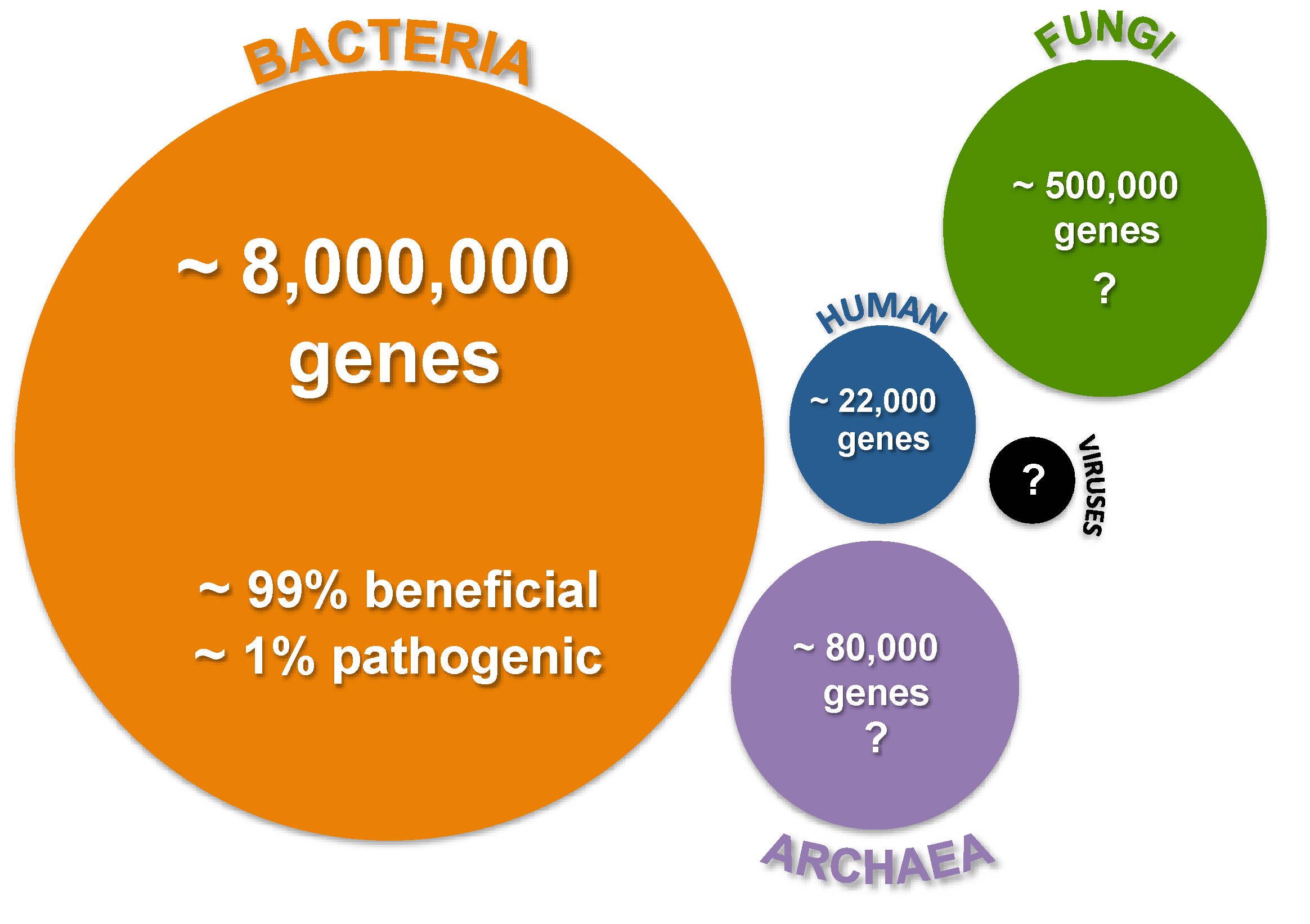 Overview of the complexity of human microbiome. Circle size reflects the approximate relative abundance of the various microbes known to associate with humans. Relative gene abundance is derived from the human microbiome sequencing project [19,22]. Question marks reflect uncertainty or potential underestimation of gene abundance.