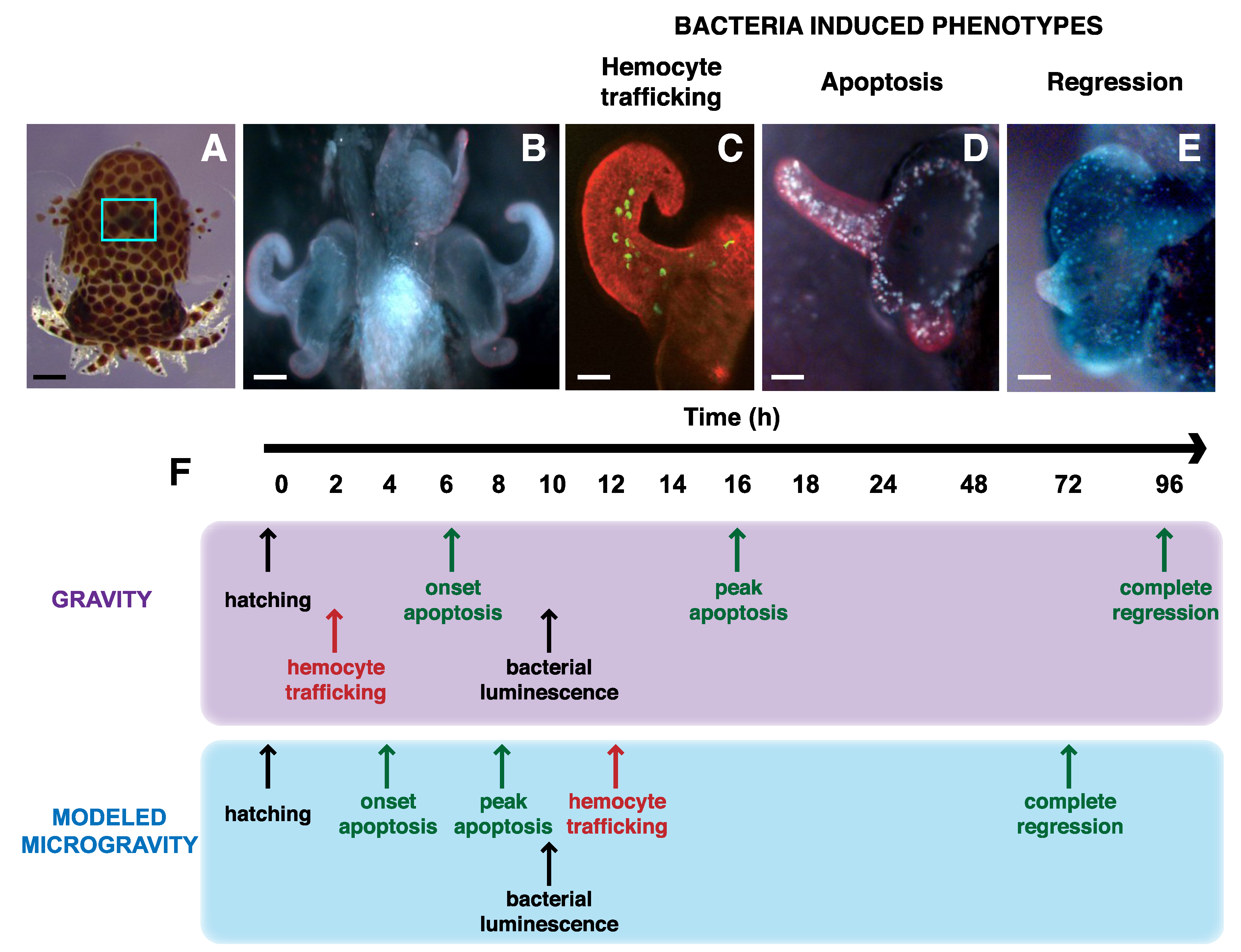 Impact of microgravity on the developmental time line of mutualistic symbiosis between the squid Euprymna scolopes and bacterial partner Vibrio fischeri. (A) Juvenile squid just after hatching. Blue rectangle marks the location within the host mantle cavity of light organ, the site of symbiosis. Bar, 0.25 mm (B) Light organ at hatching showing the elongated surface epithelium that forms appendage like structures on either side of the light organ. Bar, 75 μm. (C) One half of light organ depicting the movement of hemocytes (green) moving into the blood sinus contained within the surface epithelium upon exposure to bacteria. Bar, 30 μm. (D) Light organ exposed to bacterial lipopolysaccharide showing pronounced cell death staining pattern along the superficial epithelium. Bar, 30 µm. (E) Image of one half of light organ depicting the loss of the superficial epithelial appendage structures 96 h after colonization with V. fischeri. Bar, 30 µm. (F) Exposure to microgravity alters the developmental time line of the symbiosis under normal gravity and modeled microgravity conditions using a RWV bioreactor. Events listed in black do not change under microgravity conditions. Those events in red are delayed during modeled microgravity, where as those events in green are accelerated.
