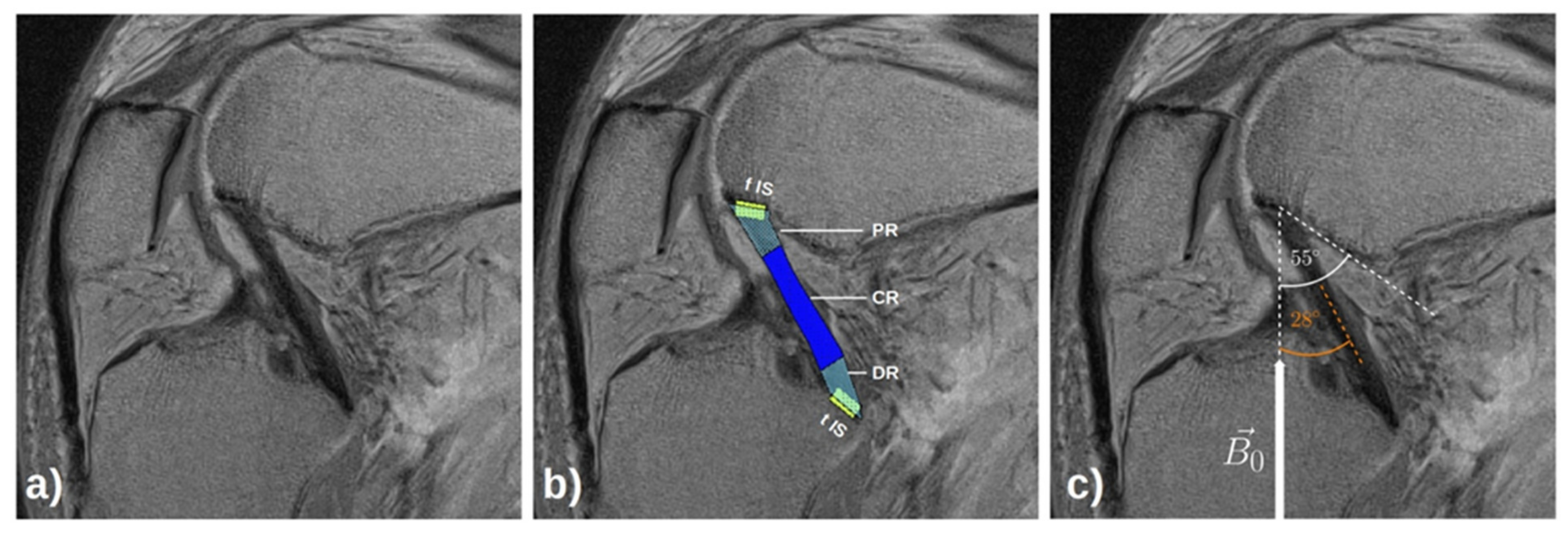 Exemplary visualization of the osseous and ligamentous regions-of-interest of the posterior cruciate ligament (PCL) and the orientation of the PCL to the main magnetic field B0. On the corresponding morphologic parasagittal image with moderate T2-weighting (echo time = 41.4 ms) (a), the PCL was identified and manually segmented. The PCL’s segmentation outline was automatically divided into quarters for further subregional analysis (b). The proximal 25% of the PCL was defined as the proximal subregion (PR, light blue), the central 50% as the central subregion (CR, blue), and the distal 25% as the distal subregion (DR, light blue). The femoral (fIS) and tibial insertion sites (tIS) of the PCL were positioned around the cortical bone of the respective insertion sites and are outlined by rectangular boxes (yellow). The white arrow indicates the orientation of the main magnetic field B0 (c). The orange dashed lines indicates the principal orientation of the PCL and an angle of 28° (orange) was determined between the PCL and the main magnetic field. Similarly, the orientation of the magic angle of 55° with respect to B0 is indicated by the white dashed lines. Same right knee joint specimen as in Figure 1 and Figure 4 (δ1-configuration).