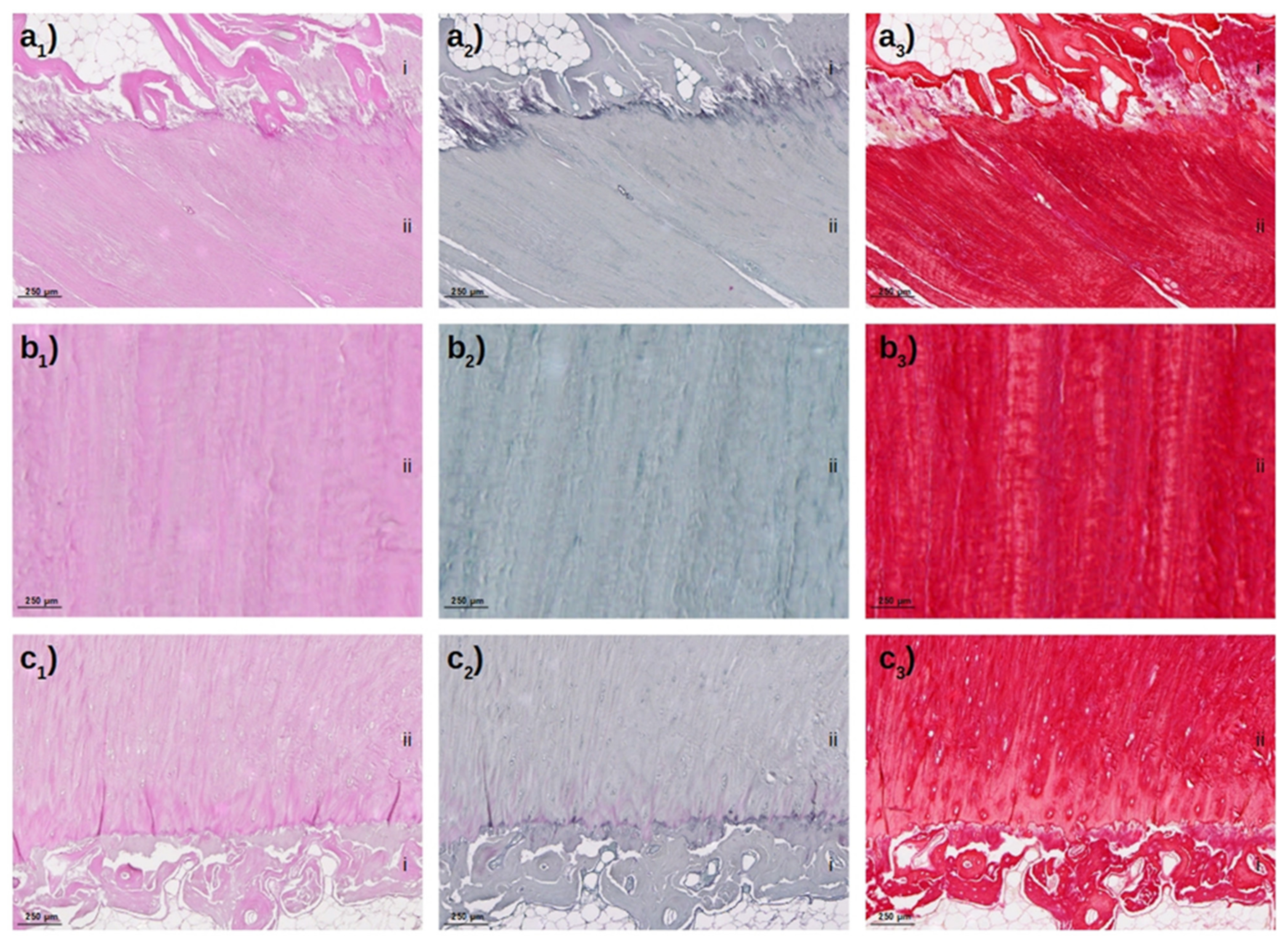 Microscopic reference evaluation of the posterior cruciate ligament (PCL). Displayed are close-up views of the femoral (a1–a3) insertion sites, the ligamentous portion (b1–b3), and the tibial insertion site (c1–c3) of a representative PCL following hematoxylin and eosin (a1,b1,c1), Safranin O (a2,b2,c2), and Picrosirius red staining (a3,b3,c3). The PCL insertion sites are intact with regular bone and calcified fibrocartilage (i) and ligament (ii). In this specimen and throughout, fibers were oriented parallel without any fiber discontinuity. Other magnifications indicated the absence of relevant thickening or thinning and degenerative changes (not shown). Bars correspond to 250 µm.