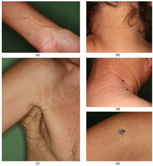 Dermoscopic (Heine Delta 20, Heine Optotechnik GmbH, Herrsching, Germany) and clinical photos were collected from all PXE-affected skin sites (the neck, the periumbilical region and the flexural areas, in particular, the axillar, popliteal and inguinal regions) of the patients.
