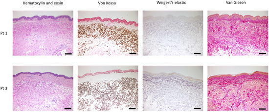 Histopathological characteristics of skin biopsies of the pseudoxanthoma elasticum patients (Pt) with hematoxylin and eosin (H&E), von Kossa (VK) staining for calcium deposits, Weigert’s elastic (WE) staining for elastin and van Gieson (VG) staining for collagen. Scale bars display 100 μm.