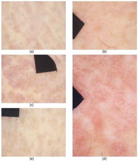 However, there were some clinically affected skin sites where the specific DS features were absent (Table 3). Namely, in inguinal regions, the typical pattern appeared only in Patient 1. At the periumbilical region of Patient 1, slightly visible reticulated vessels and not obviously distinguishable globules could be detected. There were no visible DS patterns on the chest of Patient 1, the wrist of Patient 4 and the periumbilical regions of Patient 5.
