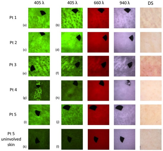 AF images showed high-contrast signal of the skin lesions even in those sites of the skin where non-typical or normal DS pattern was visible. AF images acquired from the antecubital fossa and inguinal region (Figure 4d) of Patient 2 showed a well-visible affected area compared to DS images where a non-typical pattern was apparent. The AF image from the inguinal region of Patient 3 showed clearly visible lesions, but the DS image was non-typical. AF image from the wrist of Patient 4 displayed higher intensity area, while DS pattern was completely absent (Figure 4h). AF images from the inguinal (Figure 4i) and periumbilical regions of Patient 5 revealed remarkable high intensity areas, but the DS images presented non-typical or normal pattern.