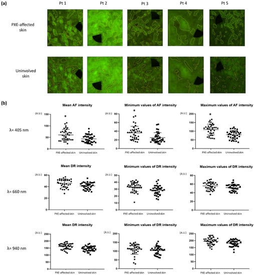 Regions of interest (ROI) selection and results of quantitative analyses of autofluorescence (AF) and diffuse reflectance (DR) images of the skin of the pseudoxanthoma elasticum (PXE) patients. (a) Marked PXE-affected and uninvolved skin areas as ROI. Patient (Pt) 1, neck; Pt 2, antecubital fossa; Pt 3, axilla; Pt 4, wrist; Pt 5, antecubital fossa. (b) In the AF images, the investigated parameters were significantly increased in PXE-affected skin compared to uninvolved skin. Analyzing DR images, no significant differences were found between PXE-affected and healthy skin. * p < 0.05. A.U., arbitrary unit.