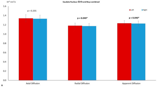 Left and right comparisons of the combined group (girls and boys) demonstrated significantly higher axial diffusion (p = 0.009) and ADC (p = 0.023) in the right thalamus compared to the left (Figure 2A). The PT has significantly higher FA in the left (p = 0.015) compared to the right. No asymmetry was reported in the globus pallidus (Table 2). The right THC pathway exhibited significantly larger axial diffusion (p = 0.003), radial diffusion (p = 0003) and ADC (p = 0.001) compared to the left (Figure 3A). The left caudate nucleus had higher radial diffusion (p = 0.049) and higher ADC (p = 0.040) compared to the right (Figure 4A).