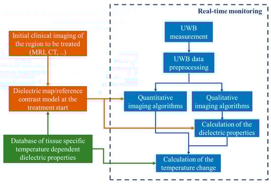 Generally, our methodology of non-invasive quantitative temperature monitoring for hyperthermia is based on continuous estimation of the changing tissue dielectric properties in the area of interest during the treatment by means of microwave sensing. The flowchart of this approach is presented in Figure 1.