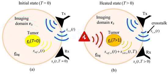 Since all parameters included in F remain constant during hyperthermia treatment, only the dielectric contrast between background and tumor will change []. For the sake of simplicity, specular reflection is assumed at the boundary between the background medium and the tumor and approximate the effect of dielectric contrast in (Equation (7)) by means of the complex reflection coefficient Γ: